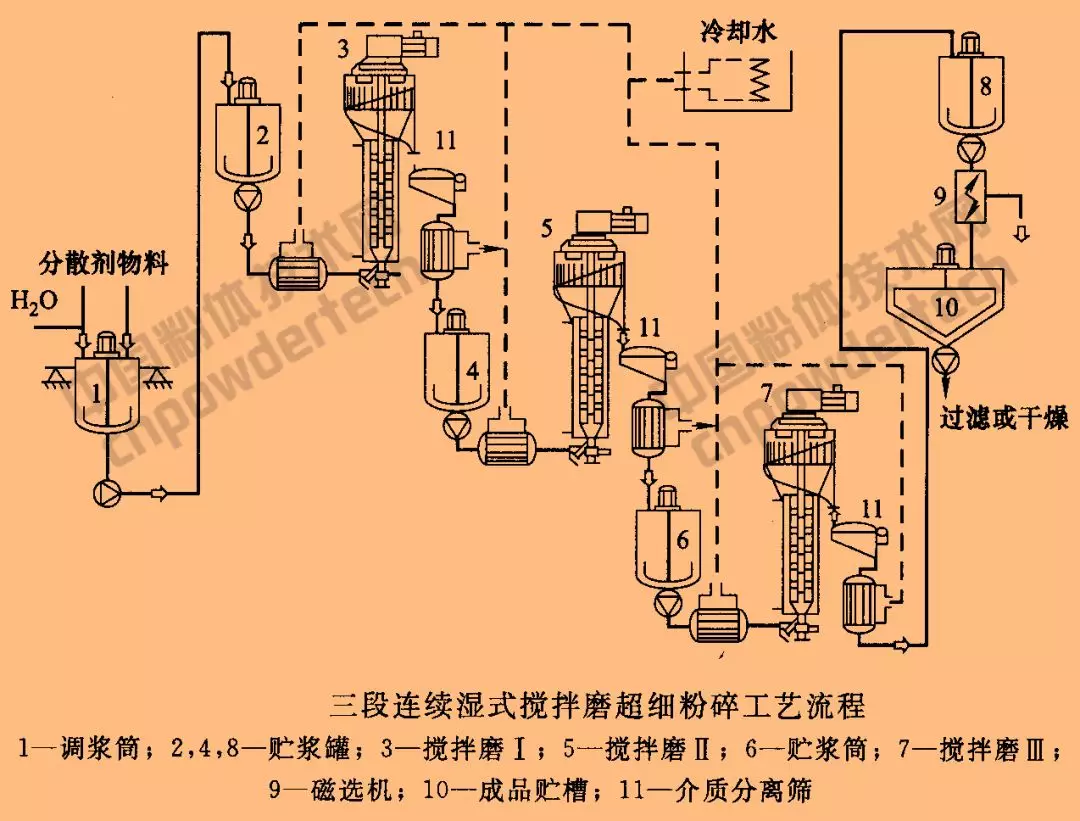 由于膠體磨和高壓射流磨工藝配置較簡單,以下重點介紹攪拌磨、砂磨機等介質研磨類超細粉碎工藝。