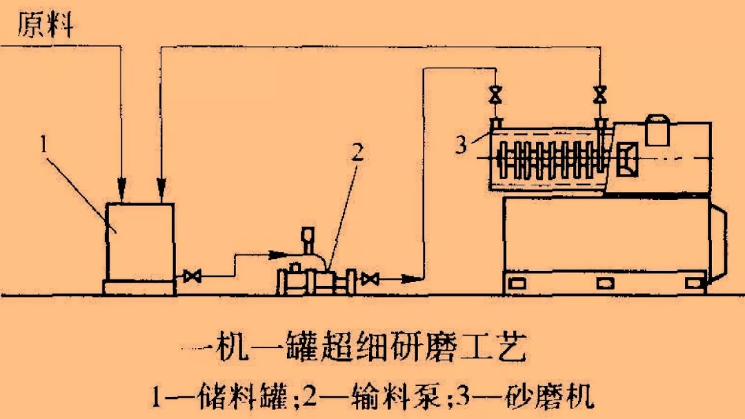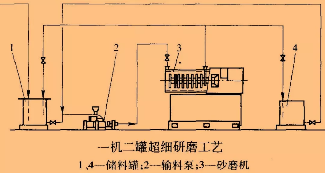 料漿在1臺砂磨機、2只儲料罐內進行循環研磨。此工藝雖比一機一罐工藝復雜些,但循環研磨層次清楚,產品粒度均勻。