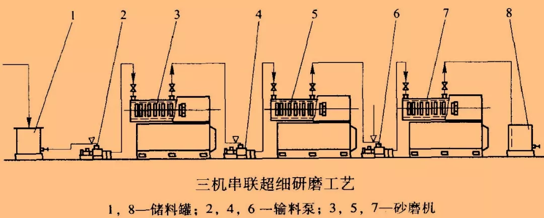 利用3臺密閉式砂磨機和2只儲料罐串聯連續研磨的超細粉碎工藝流程。在該工藝中,所串聯的3臺砂磨機分別采用不同的轉速和研磨介質。從第一臺開始逐漸減小,排料粒徑越來越細。