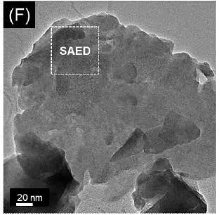 圖F為一個典型的砂磨后的Ta-LLZO顆粒的STEM照片。經過砂磨的細顆粒表面較為粗糙,對其中白色虛線框標記的區域做選區電子衍射(SAED),結果如圖G所示。電子衍射花樣為展寬明顯的多晶德拜環,最亮的環對應于晶面間距為0.31nm的(240)面。該面間距比純Ta-LLZO粉體和H+交換后的Ta-LLZO晶格中的數值大。說明砂磨后的細Ta-LLZO顆粒表面和內部晶格變形并多晶化。圖H為顆粒表面的HRTEM原子排列圖像。該圖像表明,Ta-LLZO在極小的疇區內(1~2nm)有序排列,但不同疇區的排列完全是無序的,進一步證實了砂磨顆粒的多晶化,利于后續燒結。